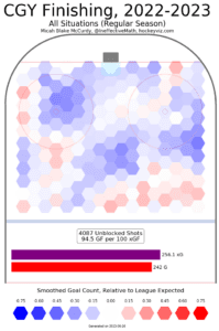 The Flames not scoring in and around the net is a bit of a problem, but one that can be fixed with time. Seeing that much blue around the crease in the viz above isn’t optimal, but if it gets better in 2023-24, we could see a huge uptick in goals scored and standings points earned.