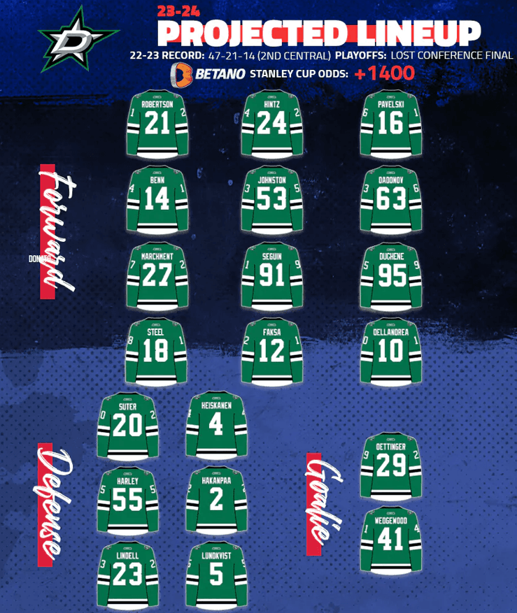 The Dallas Stars have entered the elite tier of NHL teams. They have so much going for them. The best line in the NHL with Robertson-Hintz-Pavelski. A Norris calibre defenceman in Miro Heiskanen. A Vezina worthy goalie, Jake Oettinger. They have solid veteran leaders Jamie Benn, Tyler Seguin, Matt Duchene, and Ryan Suter. Wyatt Johnston is entering his second season coming off a great rookie campaign. This team is loaded and are poised to make another run at the Stanley Cup.