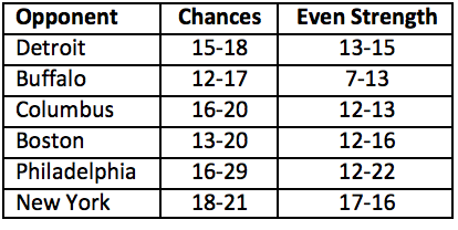 Taking a look at scoring chances doesn’t paint a rosier picture. In fact, depending on how you look at things, it might make things worse. Calgary was out-chanced in all six of their games on the road and only finished ahead in the even strength count on Monday night in New York thanks to a solid third period.
