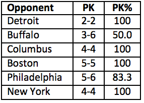 Obviously, you can’t totally eliminate what happened against the Sabres; as such, I present to you their 94.7% success rate in the four games since that night. To make their work look more impressive, Calgary was able to silence the league’s two top powerplays in Columbus and Philadelphia while adding to the woes of teams like New York and Detroit.