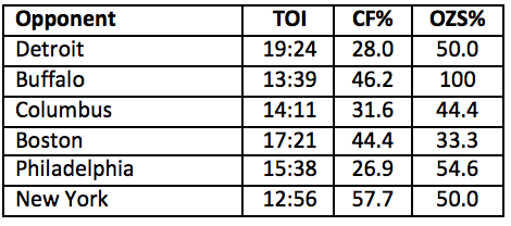 But after a brutal outing in Buffalo, the Flames weren’t able to get things back on track in their overall game the rest of the trip. From a possession standpoint, they finished underwater in three of six games, but more disturbing was their work prior to the third period. Calgary’s final possession numbers and their totals after two periods are compiled below. All stats in this piece come courtesy of hockeystats.ca.