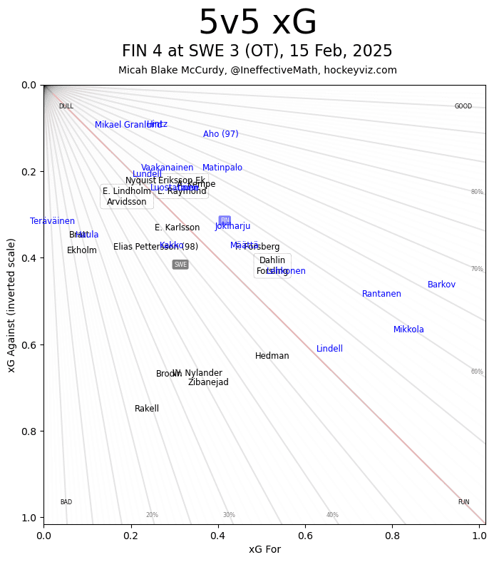 xGF% – Late in the game I felt Elias Pettersson’s (44.64 per cent) neutral zone and transitional decision making to be a bit off. He was missing some clear break-in reads which led to his line being stale on chances. I think Sweden were a bit surprised by the tenacity of the group from Finland and struggled to generate any offence because of it. William Nylander (39.37 per cent) did perhaps make the best pass for team Sweden so far with the backhand feed to Karlsson for his goal.
