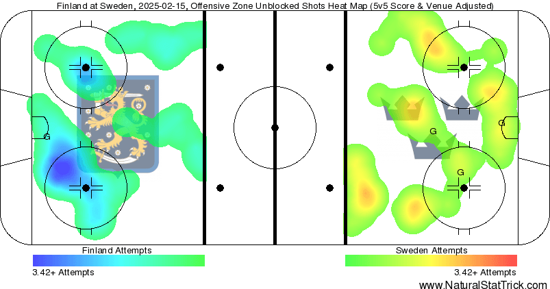 Taken By Chance – Sweden achieved a very small amount of high danger looks. The defence pairing of Gustavs Forsling (36.36 SCF% || 64.45 HDCF%) and Rasmus Dahlin (36.36 per cent || 64.45 per cent) was the standout for the boys in yellow. Erik Karlsson (73.50 per cent || 0 per cent) did score a nice goal too but was not as effective overall as Dahlin. Up front Filip Forsberg (73.44 per cent || 46.78 per cent) led with two high danger chances earned for forwards.