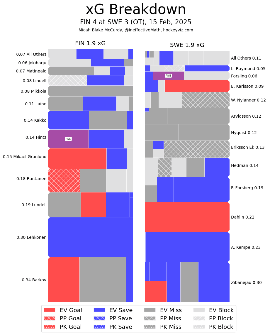 Now Sweden produced a small number of high danger chances, Finland produced less. It was not a four-star offensive game rather one where the goaltending was not up to par on either side. Aleksander Barkov – who is always a top tier player – doesn’t have his goal registered on NaturalStatTrick either. Take the percentages within this one lightly. Anyways, Barkov showed up when it mattered most with the tying goal late in the second period. A match-up nightmare there’s no surprise Sweden struggled to score. He’ll have his hands more full with Crosby, MacKinnon, McDavid next.