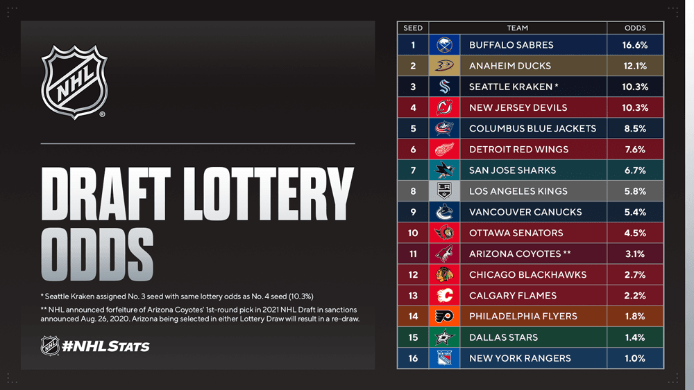 The one wrinkle is Arizona, who have been assigned lottery odds but have forfeited their 2021 first round pick due to sanctions announced last summer. If the Coyotes are selected in either two draws, the league will do that drawing again. So, the Flames kind of have better odds than the ones shown above…but…not really.