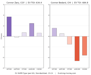 And for fun, here are their regularized adjusted plus-minus (RAPM) charts at even-strength via Evolving-Hockey. First is Zary versus Bedard: