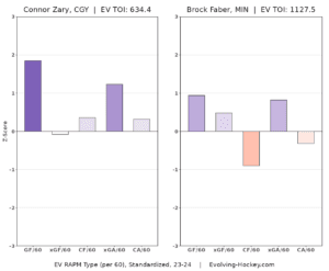 Of course, it’s important to note that deployment, the team they play on, and their role within that team can make a big difference in the results we see. For example, Faber is playing not only because of his results in “lower minutes” (he was averaging over 23 minutes in the first month of the season, so relative to his 25-minute average currently, it’s lower), so much because of the number of injuries on the Wild backend, particularly to captain Jared Spurgeon. The Wild, as most hockey fans know, is a historically defence-focused team, and John Hynes is a historically defence-focused coach. The same could be said for their previous head coach, Dean Evason.