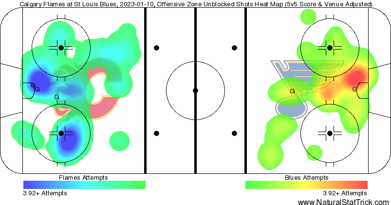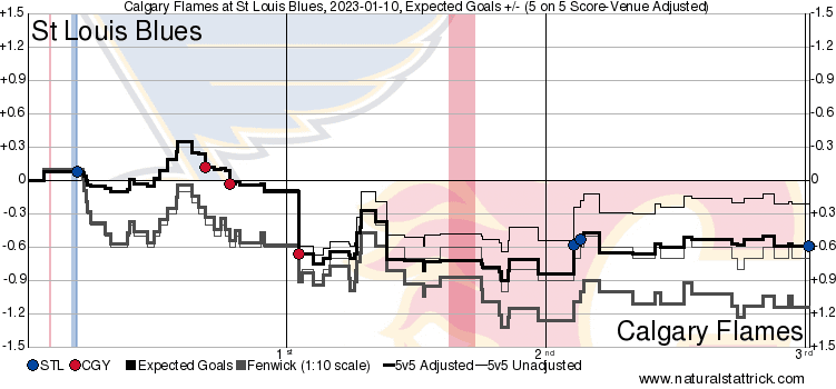 In The Crease – I’d like to think I’m quite good at looking at replays and finding exactly where the defensive breakdowns happen that lead to goals against. I do that to show why the goaltender isn’t usually responsible for the goal happening despite being the one that gets pointed at the most. Hate to do this but this one I could not find Markstrom a scapegoat for those two third period goals against. Maybe a bit of leeway for the defender not tying up the rebound on the second goal, but that bad shot saw the puck bounce right back into the slot instead of a non-lethal area. The turnover for the third happened in the neutral zone and Kyrou ripped that with only Andersson as a partial screen from above the face-off circle. 2.28 expected goals against 5v5 with a high danger and medium danger chance getting behind Markstrom.