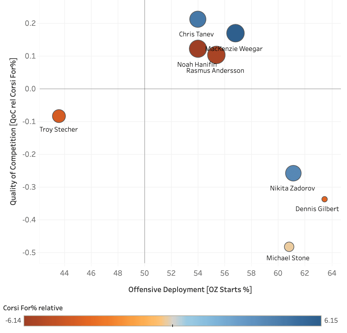 Via Dobber Hockey, here’s the Flames’ player usage chart for blueliners in 2022-23. Towards the left is more defensive zone starts, towards the top is tougher opposition. Blue indicates stronger possession numbers, red indicates weaker possession numbers.