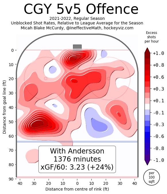 These two charts here show how the team creates offence as a unit when at 5v5. It says right there with/without and the sheer amount of disparity in attempts shows how valuable Andersson is at keeping the Flames attack alive. He’s crucial along the right side boards as an outlet when the forwards get in trouble down low. The fun part is to notice that when Andersson is out he’s not taking point shots – he’s deferring to Hanifin or getting it to his forwards for more dangerous attempts from the slot.