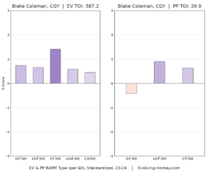 As far as the more in-depth numbers go, Coleman is still a way away from the top of the goals above replacement (GAR) and expected goals above replacement (xGAR) charts, but he ranks fourth in both per Evolving-Hockey. For reference, Connor Zary has the lead in both leaderboards with 9.9 GAR and 9 xGAR, respectively, which, in only 32 games played, is utter insanity.