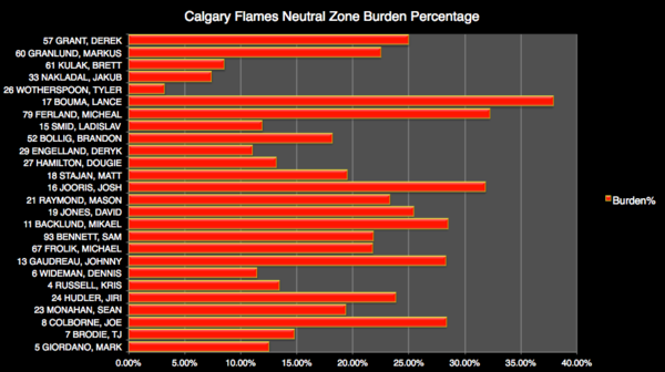 The Flames are entering the zone with control of the puck 49% of the time, which is a lot better than it sounds. The largest cluster of teams is around the 45% mark. Rarely does a team break even.