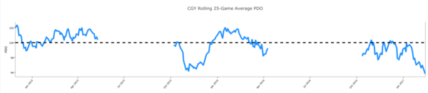 This brings us to the Flames’ 25-game rolling average for 5v5 PDO, and this season, it’s not pretty.