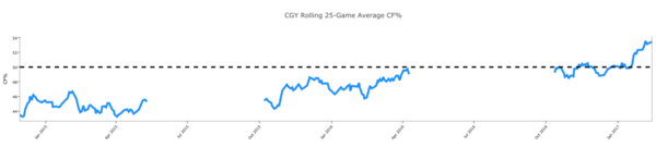 There are other ways to measure progress, though, that aren’t always reflected on the scoreboard. Via Corsica, here’s the Flames’ 25-game rolling average for 5v5 CF%, dating back to the 2014-15 season: