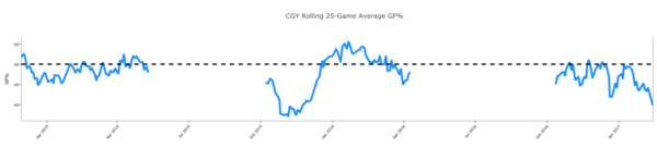 But who cares about corsi, right? Goals matter. So here’s the Flames’ 25-game rolling average for 5v5 GF%.