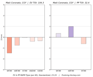 Having the start like the Flames have had and seeing Coronato sent down to the AHL is a little bit demoralizing. The star prospect, who was expected to come in and help this offense move forward as a unit with his speed and his blistering shot, didn’t do that, and now he has been “demoted.” And it’s not hard to see why, whether you’re looking at his box score number (10 games played, 1 goal, 1 assist, and even though I’m not a fan of this stat, a minus-9) or his analytics like the chart below via Evolving-Hockey:
