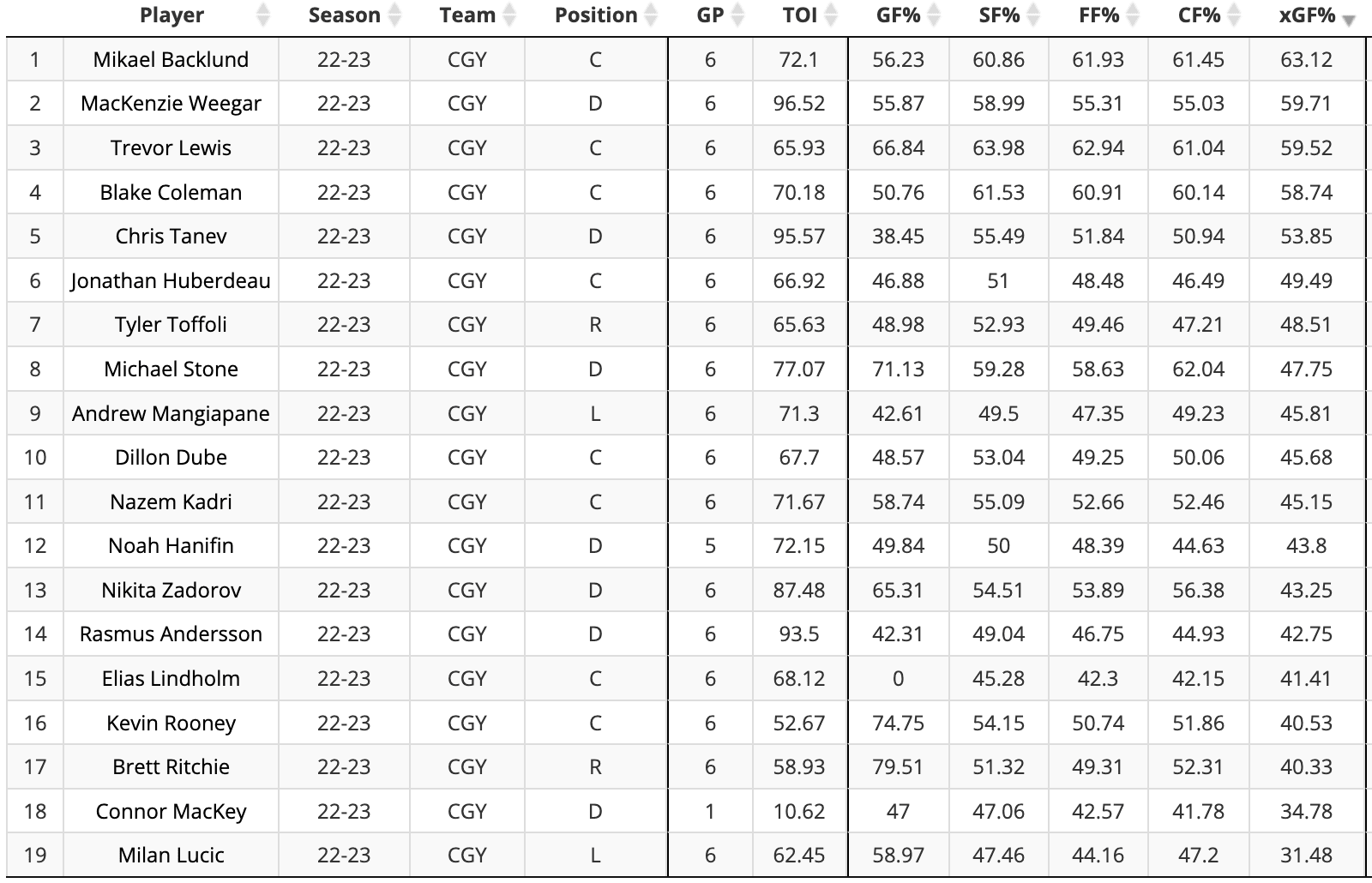 Very intriguing to see the majority of Calgary Flames below 50% in xG.Of the 6 games they’ve played they were clearly the better team in 4 games, but being extra bad in terms of chances in the other two can crater %’s when the sample size is this small. We’re going to focus on the top 6, PP1, and of course the McDavid of it all.