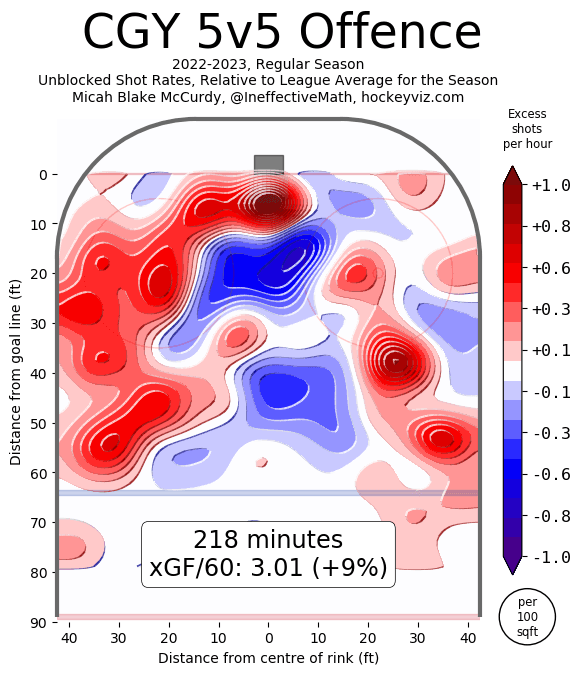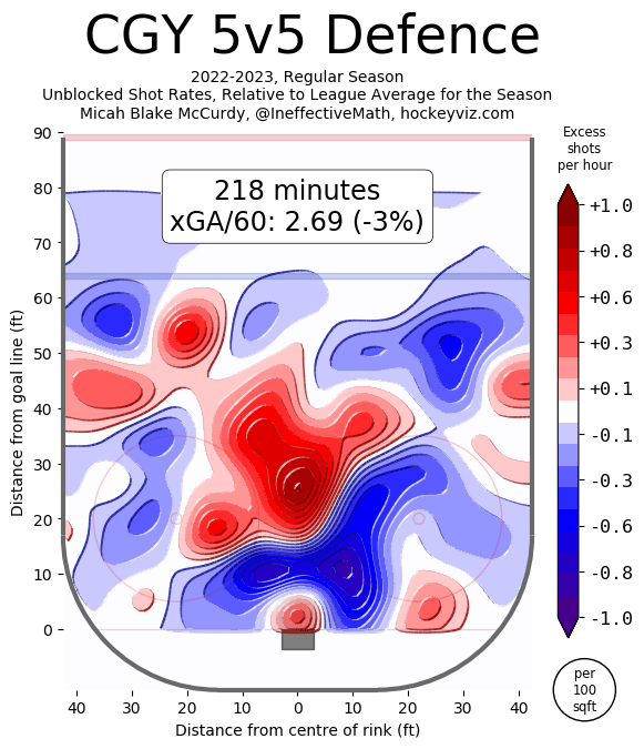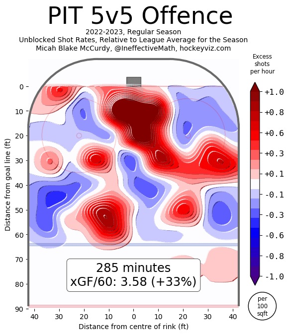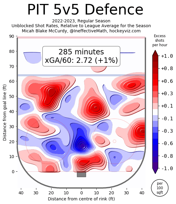 Pittsburgh to date has employed a more aggressive attack than the Flames but a worse defensive structure – it should balance out as fairly even. Calgary’s failed so far to get many goals to the right side of the goalie – getting them from the center of the slot and to the left. Pittsburgh has swarmed the right side of the goaltenders to the tune of for more actual goals than what was created in expected goals – 28 to 24.2.