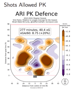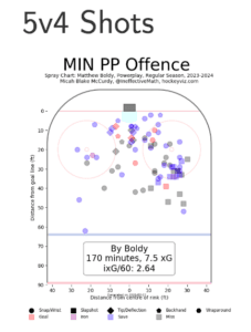 With data provided by Hockey Viz, let’s check out where the Coyotes allow most of their shots on the powerplay and compare them to where Boldy gets most of his power play shots on goal.