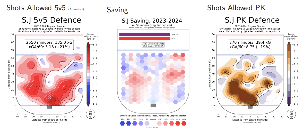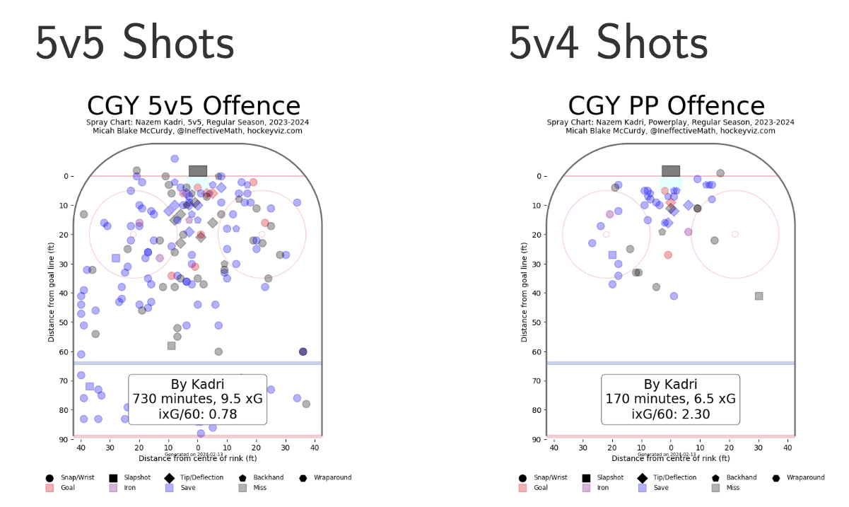 San Jose allows 3.0 powerplay opportunities per game in the last 10. With data provided by Hockey Viz, we can see where the Sharks allow the most shots at 5-on-5 and on the Penalty Kill and compare them to where Kadri takes the majority of his shots.