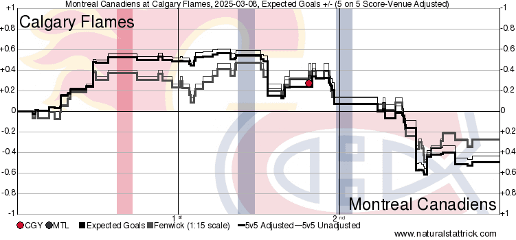 xGF% – I’m genuinely curious if the Flames remembered that Kevin Rooney (4.86 per cent) is a problem most nights. He did get the least amount of 5v5 time in this one, but he’s an offensive black hole. If you had a top nine forward group getting you three to four goals a game you could get away with this, but as the roster is currently constructed the fourth line center needs to contribute too. I’ll be nice to Joel Farabee (35.54 per cent) because he scored, but I do think his line showed signs of struggle again. Mikael Backlund (37.79 per cent) has not been playing with that same offensive pop he used to have. Breaking up the wing and getting decent shot opportunities are not happening anywhere near the rate of the last four to five seasons. The third period strategy to play defence in your own end for 15 minutes doesn’t help with this issue either, but the decline has been more than just strategy based or situational.