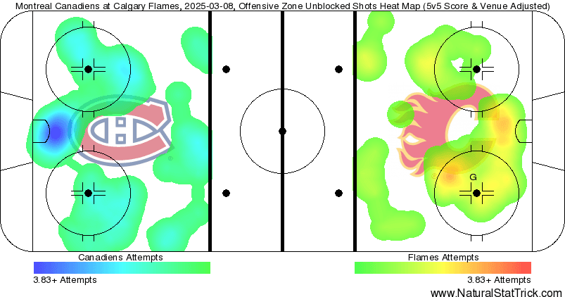 Corsi King – I will relay some positive performances here, but what good are shot attempts if you can not convert them into goals? Slow streaks are one thing, but this version of the Flames seems to be allergic to any type of goal. Getting all of your offence out in one game against Philadelphia and then failing to build on that going forward just comes across as a bit sad. Yegor Sharangovich (61.65%) led the Flames forwards with a fifteen to nine advantage. Joel Hanley (59.48%) led the rearguards with a nineteen to thirteen advantage. As you will see soon not many of them were dangerous.