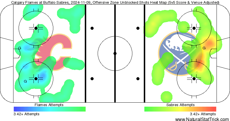 Taken By Chance – Daniil Miromanov (49.99 SCF% || 100 HDCF%) and MacKenzie Weegar (44.40 per cent || 100 per cent) did not see a 5v5 high danger chance against them while being involved in multiple chances for. Buffalo really fell off the wagon near the end of the game, but credit to the Flames defence who did a really good job of protecting the middle of the ice late. On the flip side of things Rasmus Andersson (49.39 per cent || 29.20 per cent) and Kevin Bahl (49.44 per cent || 29.20 per cent) saw 5 high danger chances against. When you are trailing you have to sacrifice a bit defensively and Rasmus Andersson is going to try and help get offence for his team at every chance. I’d rather him keep driving offence from the backend when down 2-0 then shelling up and playing conservatively.