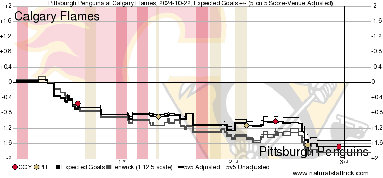 In The Crease – I think, given the amount and quality of shots against, that Dustin Wolf did a darn good job against the Penguins. His athleticism blows me away regularly. I watch these games with an ease in my mind because I’m not worried about bad second opportunities ruining momentum. Three games in he has shown everything you want of him and more. Might want to get that glove side figured out for the next shootout – the Penguins first three shooters all had him beat in the exact same fashion, other teams will notice that for next time