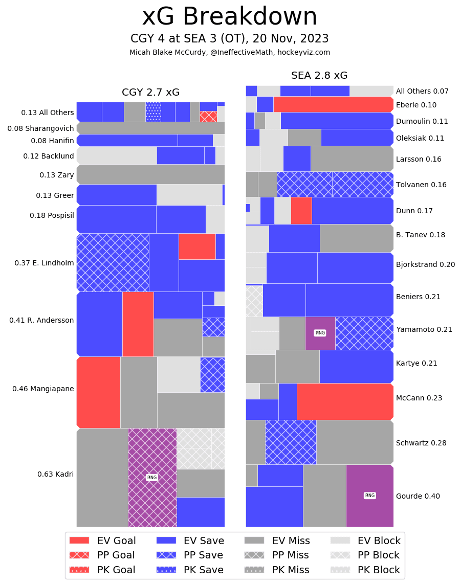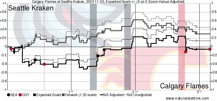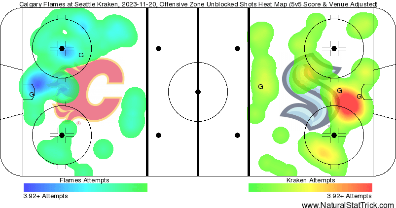 Corsi Clown – Walker Duehr (16.42%) came in the lineup for Ružička but hardly played. He kind of lost that jump he had to start the season, it currently resides with Pospisil (46.79%). Calgary let the Kraken on the outside of their zone for long stretches of play but found a way to keep the ice tilted their way in the third period. If they can sort out the mid-game lull, they won’t need to resort to a cardiac comeback attempt.