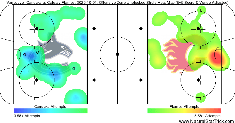 Taken By Chance – I was extremely happy that the Flames did not settle for point shots at 5v5 and actually tried to crash the crease. Kevin Lankinen was rock solid, and the high danger looks Calgary did get were not enough to beat him. Fun fact: Brayden Pachal (59.80 SCF% // 100 HDCF%) led the way at 5v5 with no high danger chances against while being on for 5 for. Zayne Parekh (55.52 per cent // 100 per cent), Pachal’s partner playing on his off-shooting side, also slayed with a great outing. He’s a stretch pass king and has shown tremendous skill at breaking the play out of his own zone with crisp, accurate passes. He’s clearly going to develop into a major problem for opposing teams with a weak pressure system. Did four goals go in on him – yes, but I’ll take the ridiculous positives with the growing pains any day oof the week. Besides this is a great showcase of how bad goaltending can affect +/- and why we need to be very careful how much weight we put behind that stat. (Parekh was -4)