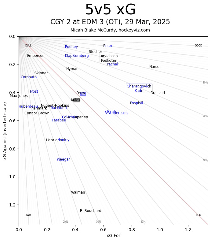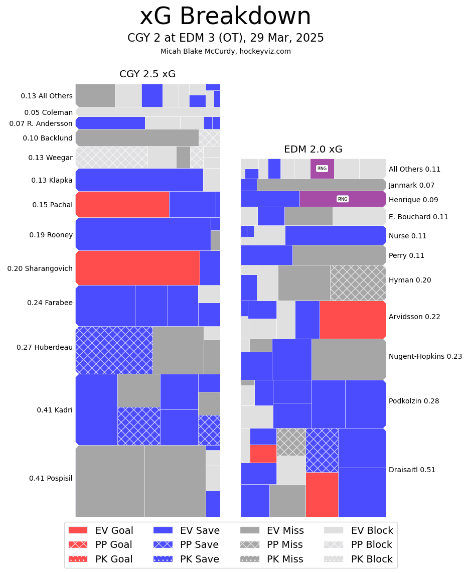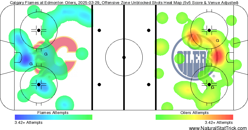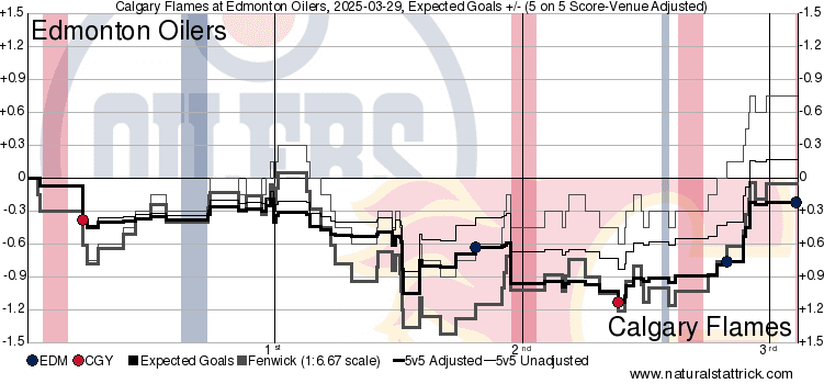 In The Crease – Dustin Wolf did not get the last laugh with Leon Draisaitl, but he sure did make him work for his goals. Prior to the third period Wolf had been thwarting him regularly – this includes a point-blank blocker shrug off I’m sure Draisaitl doesn’t see too often. In the end Draisaitl got the win – the Flames are in no position to be losing any more points which stings them more. Not any one person’s fault, but they are just out of time. 2.32 expected goals against with just two 5v5 goals getting behind him.