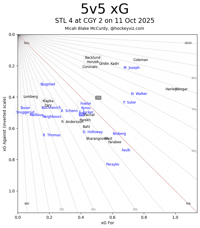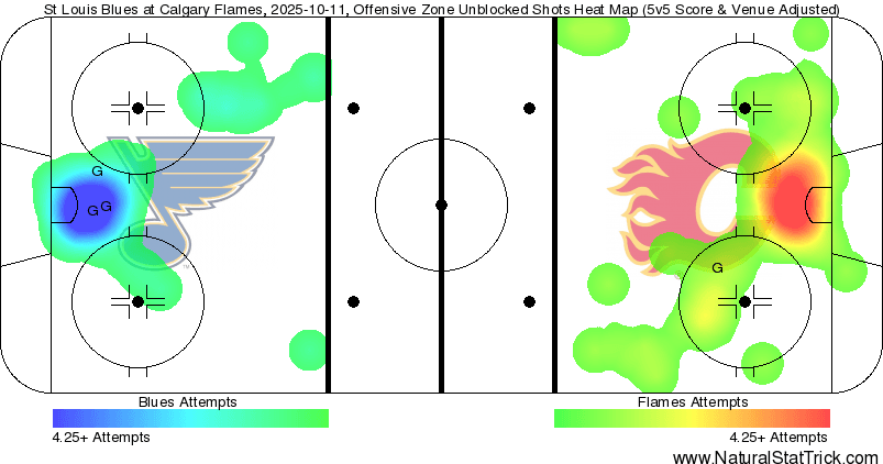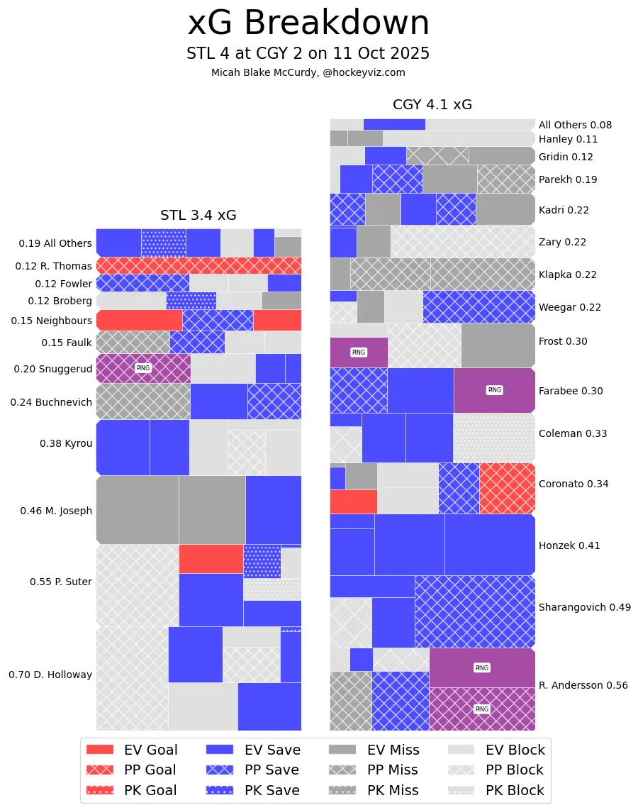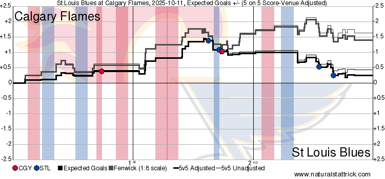 Taken By Chance – The high danger chances in this game were 15-14 in favour of the Blues. That’s quite a bit more than the Flames usually get and certainly more than they usually give up. Joel Hofer was a nightmare against them having their number multiple times and especially in the early part oof the second period. Two players that have stood out with amazing flashes so far are Joel Farabee (36.64 SCF% // 35.58 HDCF%) and Morgan Frost (36.63 per cent // 35.58 per cent). Morgan Frost has been very noticeable all over the ice offensively and Joel Farabee was a shot blocking robot. Now, they did surrender 9 high danger chances against in this one, generated 5 of their own, and were on for a 5v5 goal against. I did not like Yegor Sharangovich (33.04 per cent // 35.58 per cent) with them. Sharangovich needs to be more shot happy if he is going to stick around a middle-6 for the duration of his five year deal. He has been a decent PK option and had some limited ice the first game, but he needs to produce goals and do it regularly. This team desperately needs finishing and Matvei Gridin (61.49 per cent // 69.14 per cent) has already earned more ice and opportunity than him by a landslide. When Huberdeau comes back – and it won’t be long – less PP time and 5v5 time will be available. If Sharangovich wants to make sure it’s not him that loses it he needs to produce tangible offensive production.