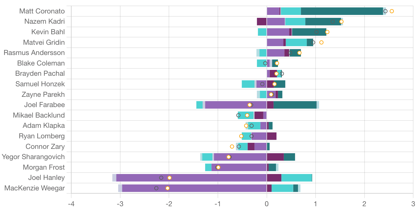 Zayne Parekh (44.41 per cent) too because why not talk about what people actually want to read about. He had limited defensive zone starts – only saw one face-off there at 5v5 – so he was deployed rather carefully under the watchful eye of his coach. He was not out for any of the goals scored against the team and looked more than ready to play in the NHL. He needs to learn to slow things down in his own zone and not make default decisions just because they worked earlier. The other team will adjust to your habits in the NHL must faster than the OHL so making sure you’re at least observing what you’re doing before making a pass up the boards is necessary. All that is just normal growing pain stuff that will fade away over the long run. He was a smooth, smooth skater all night and used this rocket of a zone exit pass that the wingers need to do a better job of handling. Nobody on the Flames defence in recent memory had THAT crisp of a first pass out of the zone. Once he’s really comfortable and can start to get creative I look forward to the results.