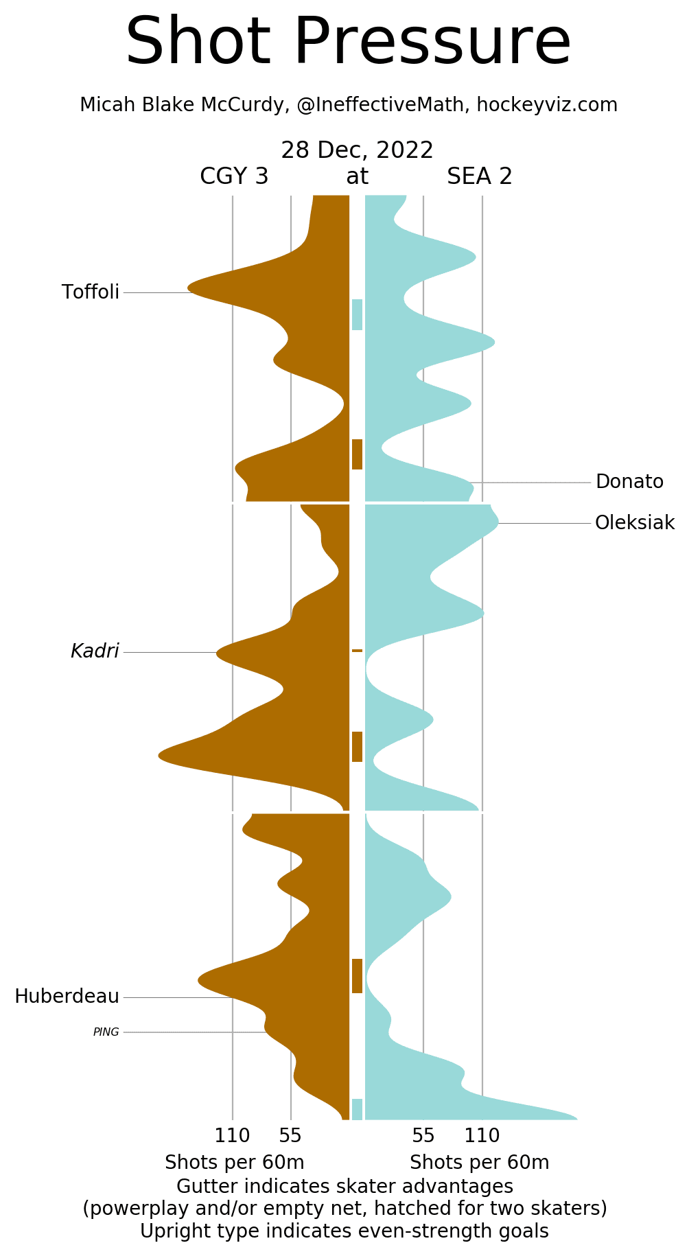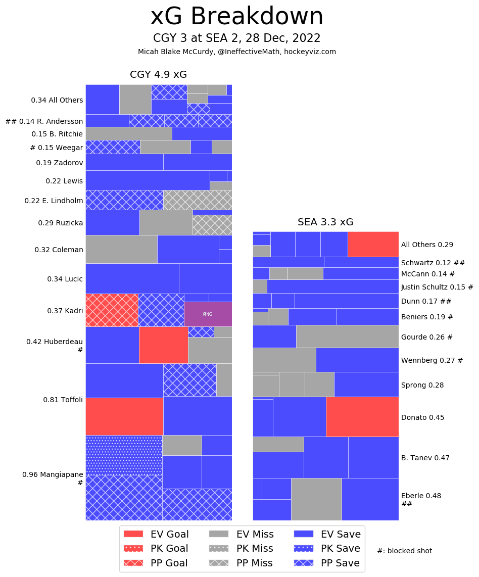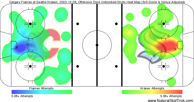 Corsi Clown – Elias Lindholm (31.52%) and his line found themselves on the other side of the Kraken’s best players – and yet he still graded out positively in expected goals and high danger chances so getting out shot attempted means next to nothing. The only player to have a negative differential in overall attempts and quality of chances was Trevor Lewis (46.63 CF%)