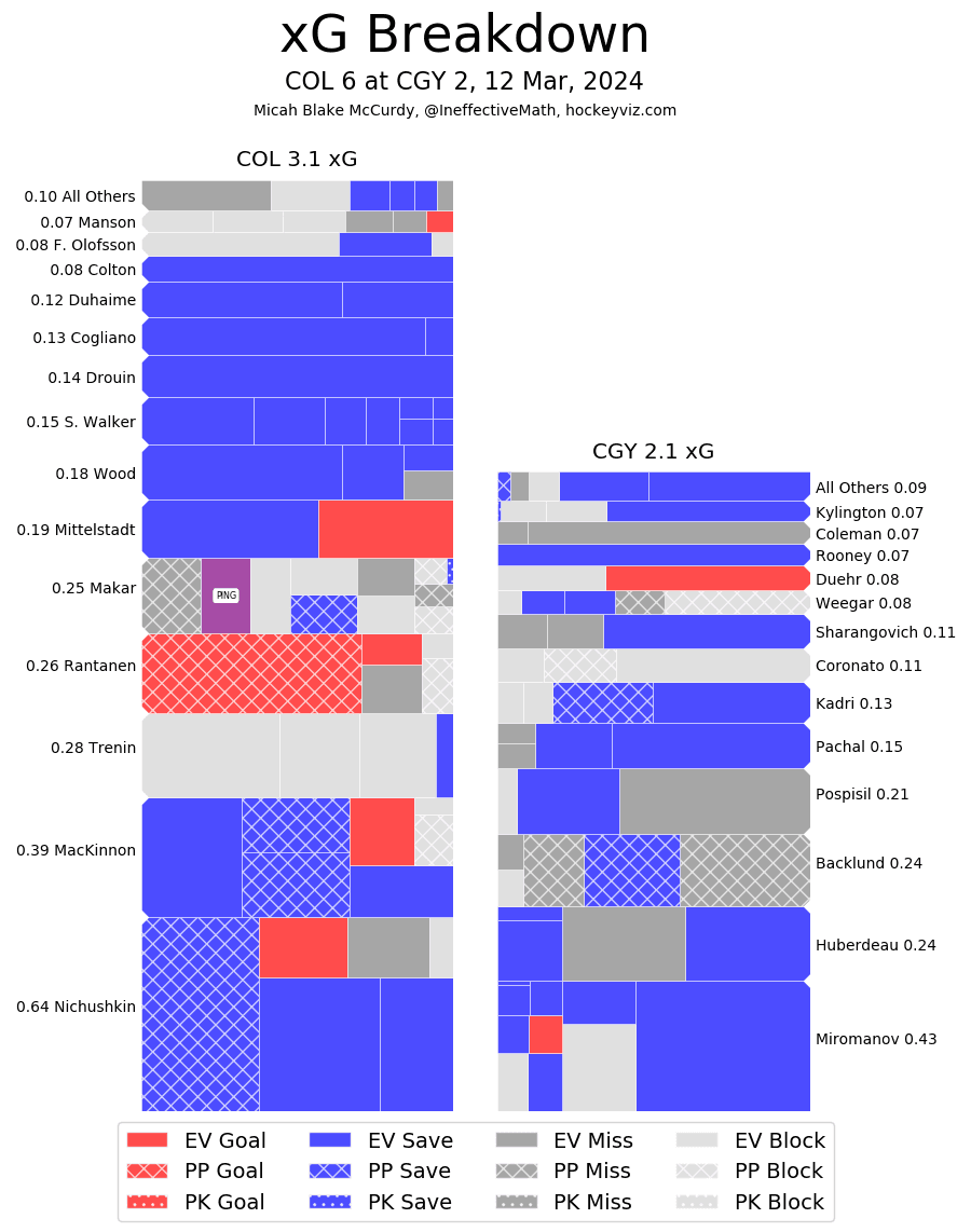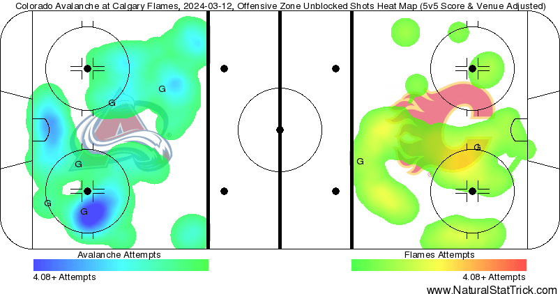 In The Crease – I don’t think the Flames left their goaltender out to dry – For about the fourth time in here I just think the Avs were overall a better team. There were some bad angle goals on Vladar – Rantanen and Mackinnon were bad angle and high – we can talk about the skill level of those two all day, but I still think that was a hole in Vladar the Avalanche identified and exposed. 6 goals against, 2 medium danger and 3 low danger, on just 1.94 expected goals against. Oh yeah just 40 minutes too.