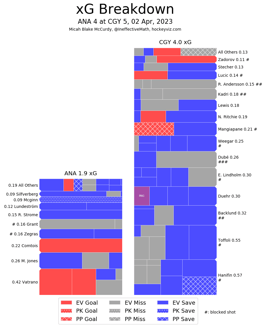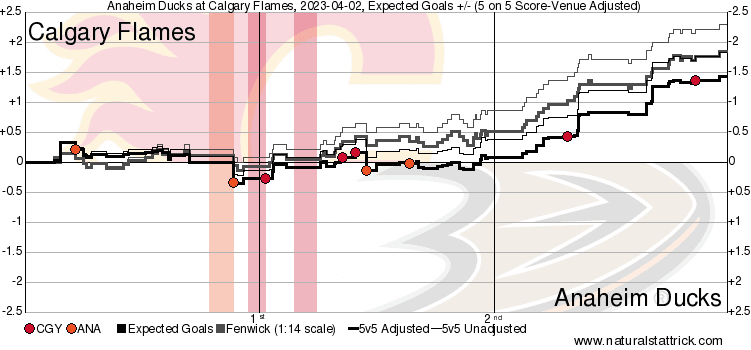 In The Crease – I’m not going to lie and say the Flames got particularly good goaltending because they didn’t. It didn’t matter though because the offence came through so this gets left in the rearview mirror. I feel bad for one goal – the nasty screen – I don’t think anyone was stopping that shot. Then again all I really know are big saves and bad goals. 1.65 expected goals against with 2 high danger, 1 medium danger, and 1 low danger chance going in.