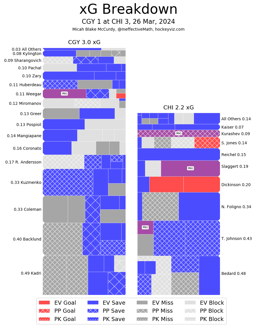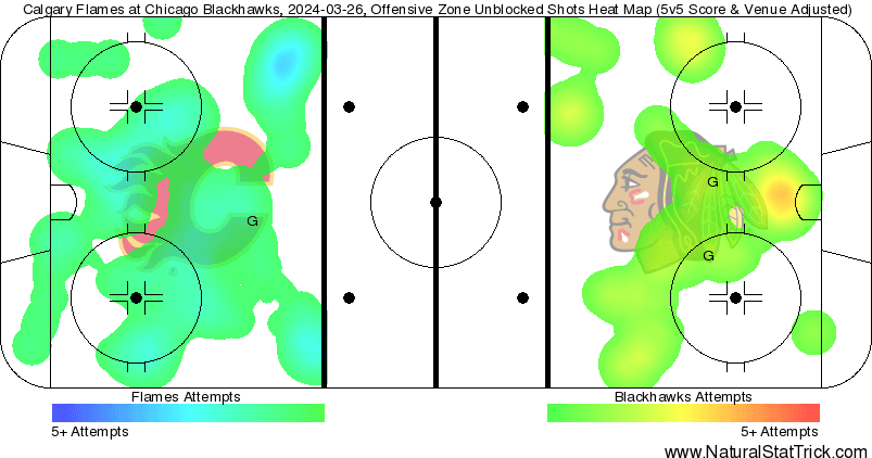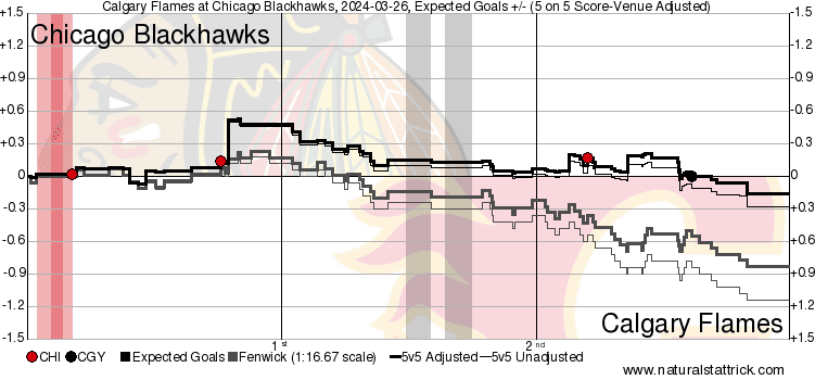 In The Crease – Markstrom may have got bored at times as the Blackhawks didn’t always go back and forth in trading chances. They really struggle through the neutral zone and cough up the puck a lot. Bedard doesn’t… but he doesn’t count right now. 1.34 expected goals against with 2 getting behind him – not ideal but certainly not the end of the world for the situation Calgary finds themselves in.