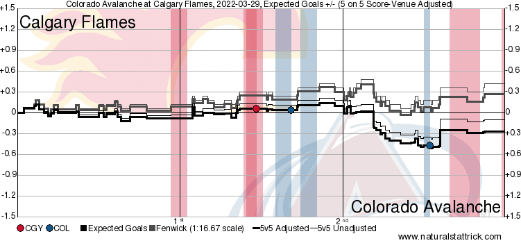 In The Crease – That pass to the second Nichushkin goal Markstrom had absolutely no chance on – that passing lane has to be covered by a defender, or at least Nichushkin himself. Markstrom allowed no 5v5 goals against for a “shutout”. 1.59 expected goals against with nothing at 5v5 getting by him. Apparently, it was just Nichushkin that had the key to solving Markstrom. No complaints for the Flames goaler from myself anyways.