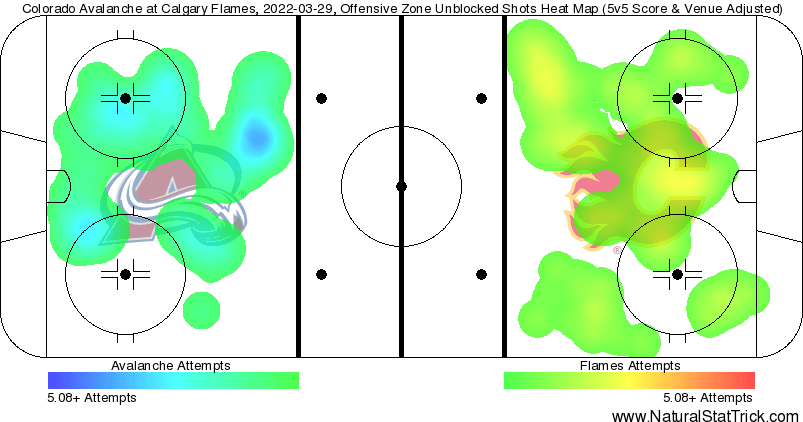 As you can see the total attempts just kind of muddled each other for 2 straight periods. The Avs found some significant jump in the third and ended up drawing a penalty because of all their possession – it just so happens that also earned them the win. Calgary doesn’t miss some zone clears and they probably don’t take that penalty. Oh what could have been – but that’s how lessons are learned.