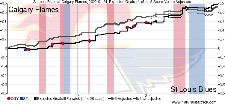 It’s a Team Game – Coming into this one the Blues were 8-2-2 against Pacific division teams, and they were on the second half of a back-to-back having beaten Vancouver 3-1 the night prior. That still is no excuse for the entire roster to come out and lay as bad a goose egg as they did. There should not be a happy person in that Blues organization because this one was embarrassing for them. Calgary ultimately being able to build off the strong 5v5 play from the loss against Edmonton, they’ve looked like the start of the season Flames for the last 2 games – a very good sign indeed.