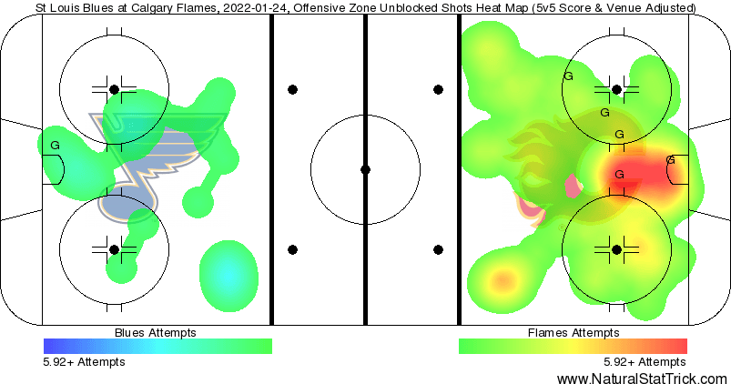 Corsi King – In the most dominant Flames game of the year the two guys at the top are who you would expect (he says knowing that it’s not what they expect). Erik Gudbranson (88.41 CF%) and Adam Ružička (86.16%) led the way as 8 players finished with ratios over 80%. Nikita Zadorov (83.60%) again, beautiful goal. Maybe the Blues tendy had to deal with a partial screen, but he still put that puck where it needed to go.