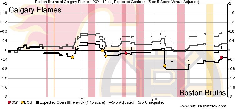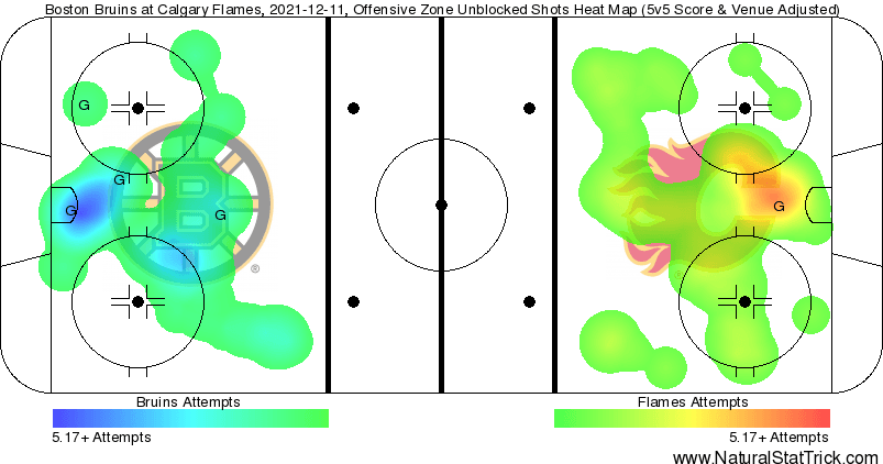 There is a very serious difference between regular 5v5 metrics and metrics that are adjusted based on score & venue. The SVA numbers adjust for home ice bias, and both leading & trailing score effects. NaturalStatTrick uses a model created by HockeyViz.com creator Micah Blake McCurdy. I preface with all of this information before I present both sets of numbers, because they do indeed tell two different stories of the Calgary Flames’ loss to the Boston Bruins on Saturday night.
