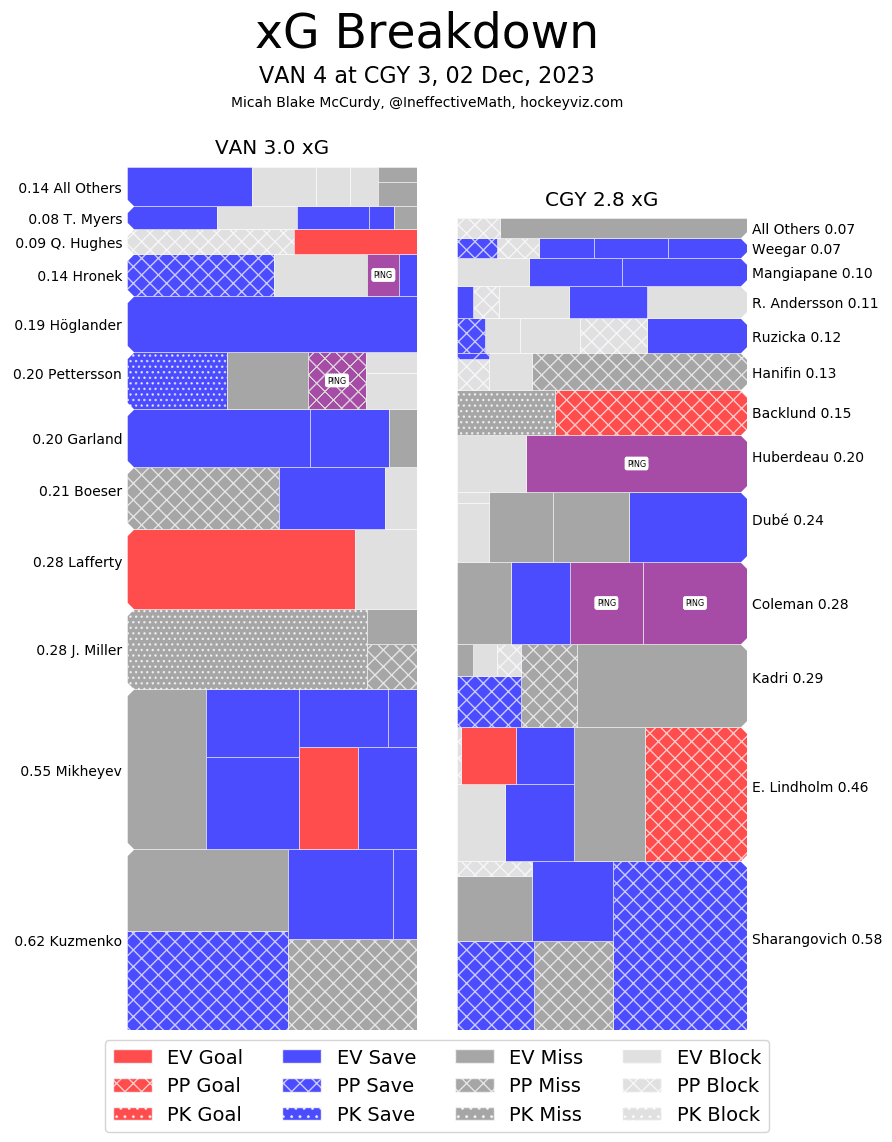 xGF% – Jordan Oesterle (0%) finishing with no expected goals can’t happen. You can’t have a defenceman play an entire game in his own end and then turn around and play him in the next game. There has to be a standard for guys that are supposed to be developed already. You do never stop learning – I believe that – but at 31 years old the leaps in growth are marginal for most. The whole team lost their quality share battle outside of Mikael Backlund (64.23%) and his line, just not the most well put together this roster has been.