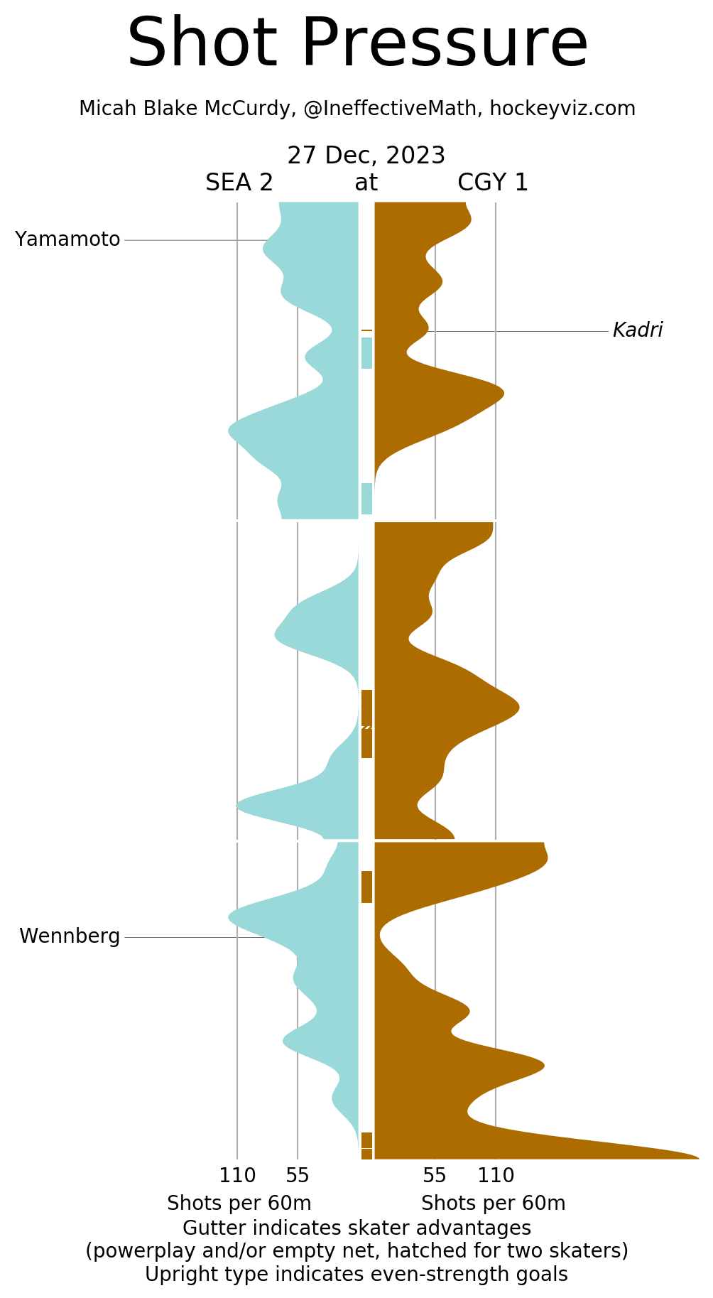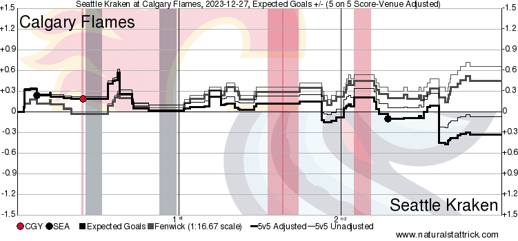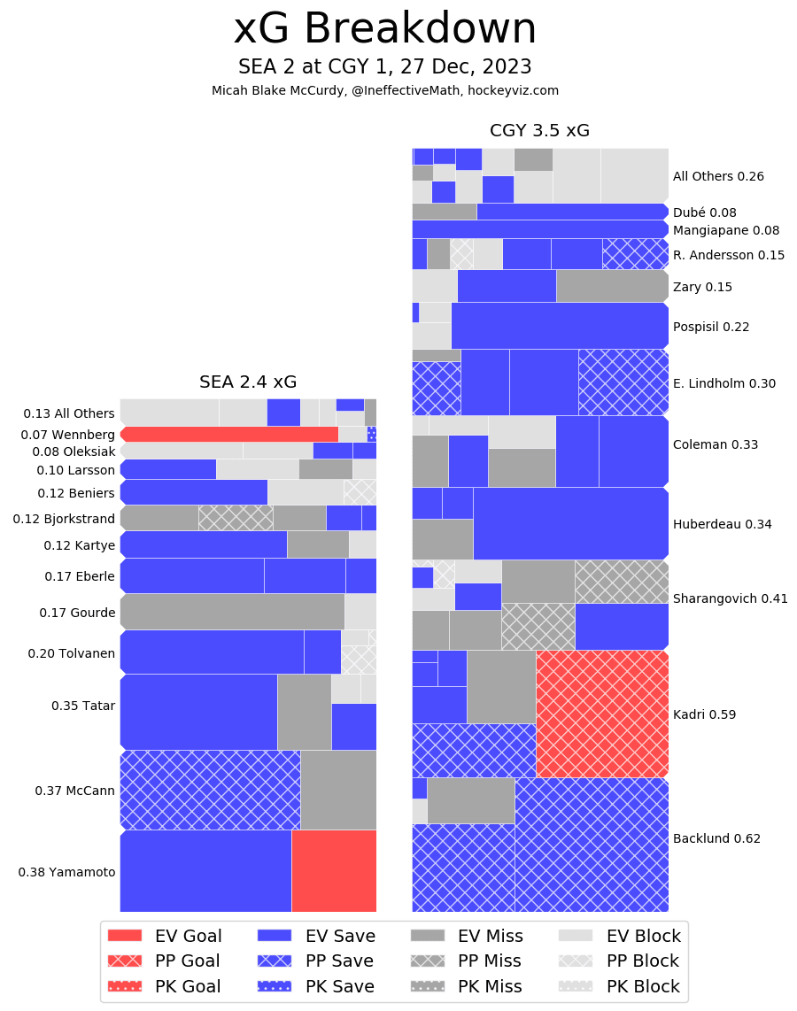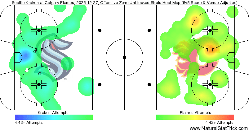 xGF% – Always worth bringing up when your top defencemen perform as such – Rasmus Andersson (64.39%) and MacKenzie Weegar (63.52%) showed what they can do against a team with great depth and minimal star power. Huberdeau (74.31%) generating almost a full goal worth of expected value for led the team in quality share. The fourth line all finished under 15% with the third pairing defence sitting right around 30%. The Kraken depth cooked the Flames lacklustre depth when it mattered while the top line guys found ways to generate success.