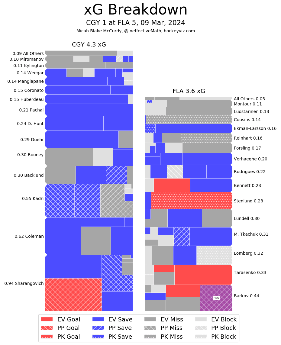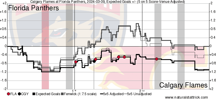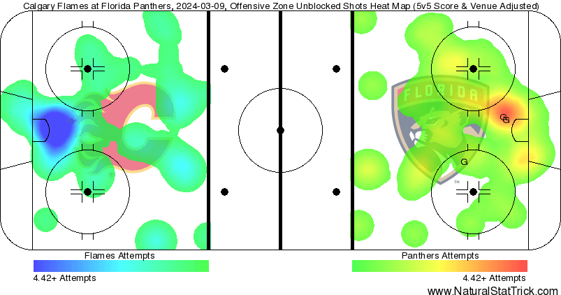 In The Crease – It is not often someone else has out-duelled the Flames Vezina calibre netminder, but that happened in a big way in Sunrise. Stolarz had a 5v5 shutout of over 3.5 expected goals against. Markstrom letting in 3 on 2.76 should have had his team in a spot to at least press late but instead they get the performance of the other guys career. Getting goalied usually only applies when you were going to run away with it and the other guy steals the game away, in this case the Panthers goalie took what could have been a close game and made it look one-sided for the home team.