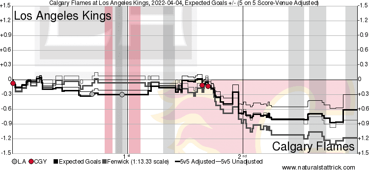 In The Crease – NaturalStatTrick is not a fan of Adrian Kempe’s goal attempt classifying it as low-danger. I would call it more in the medium range – it was a lateral pass but there was also no traffic. Either way the rest of the game Markstrom was simply superb – 1.86 expected goals against with just the one low danger 5v5 goal against. He was tremendous in aiding the PK and as the Flames defended their lead late.