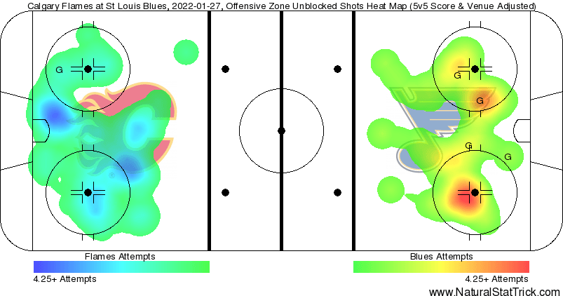 Not the normal amount of heavy attempts from in tight, but still a decent enough amount that I’m impressed Husso didn’t allow any of those extra dangerous chances by him. He’s been lights out this season for St. Louis in a truly tremendous come from seemingly nowhere story. The other abnormality in this games chart is the excessive amount of attempts from the top of the left face-off circle. Usually Calgary makes a more of an effort to get to the net – the Blues were able to keep Calgary out of the right side crease quite effectively. I see you, Colton Parayko.