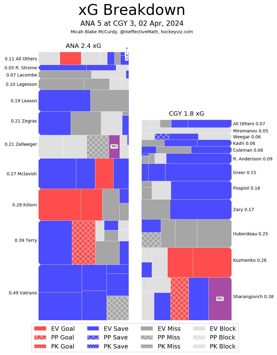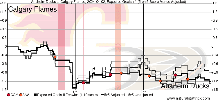 It’s a Team Game – Really the only period where they got outplayed was the first. High danger chances were 7 to 2 in favour of the Ducks. The Flames bounced back with a stupendous second only to just crumble in the third. They were so close to keeping things pedal to the meddle, instead the Ducks got a rush goal, and the Flames only scored again off a bounce and not a shot. You take the goals any way you get them, but finding better chances instead of settling for deflections through traffic is a much preferable strategy – one Calgary’s been getting away from down the stretch.