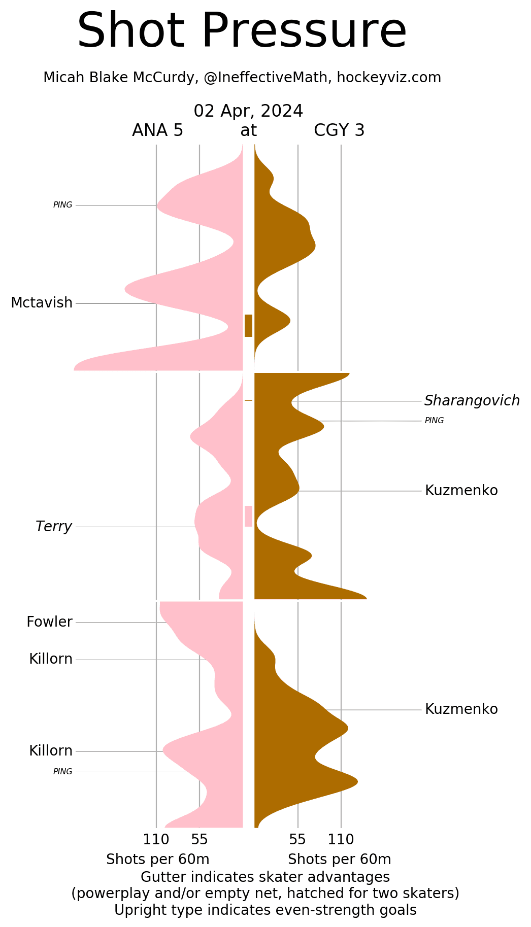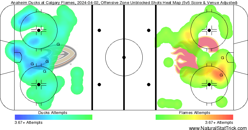 In The Crease – I mean Markstrom didn’t make the usual Markstrom saves, and the Flames lost. Some distance goals through traffic got by him – maybe all the time off has him out of his groove. Who’s to say. Anyways the Vezina isn’t in reach, neither are the playoffs, and continuing to cycle between him and Wolf, probably the move. 4 goals against at 5v5 on 2.48 expect goals against.
