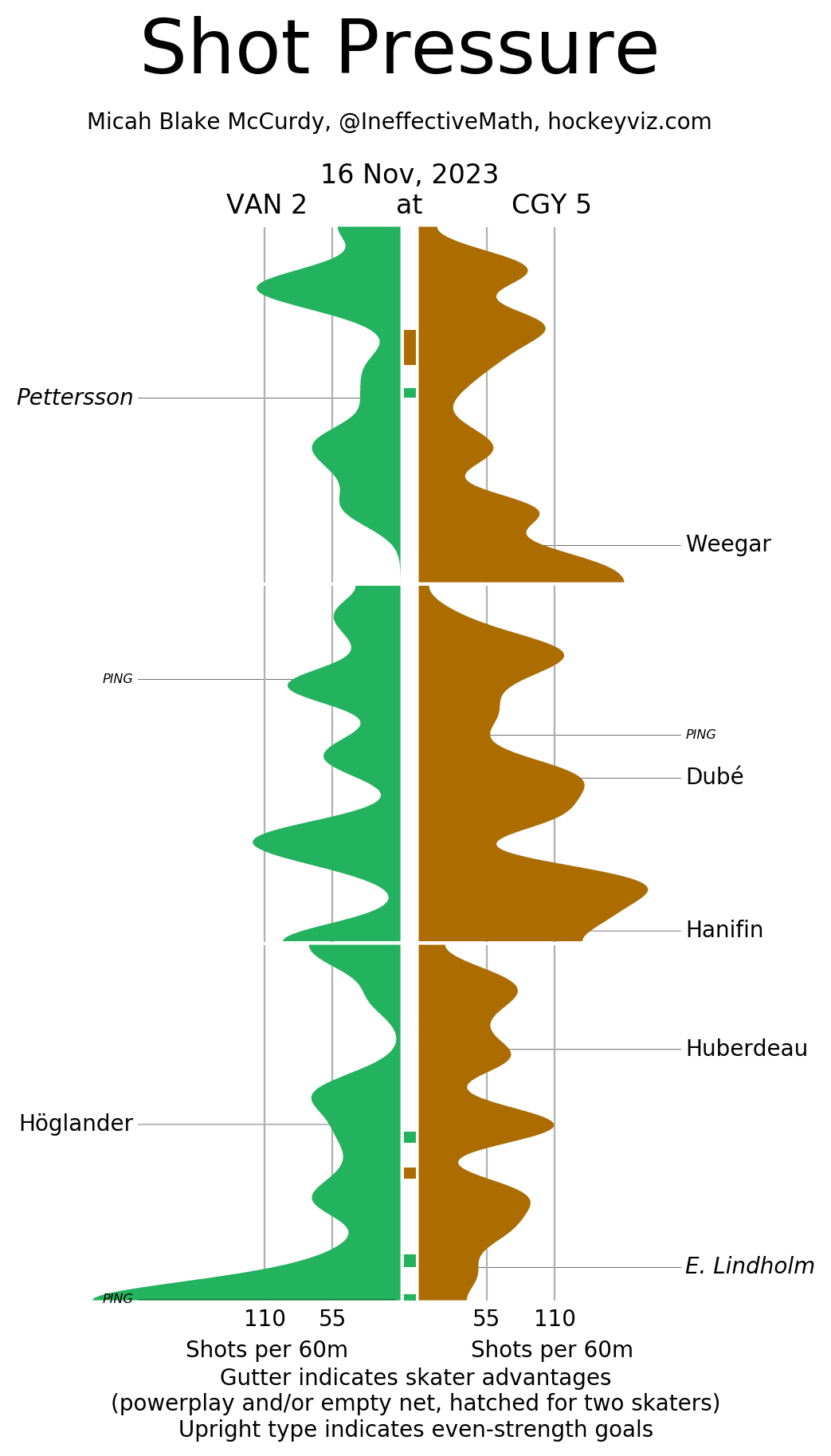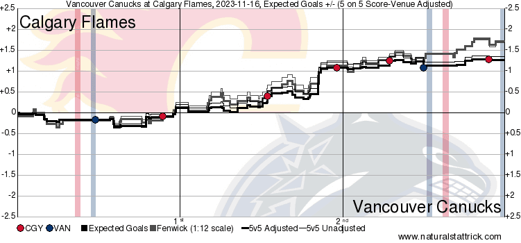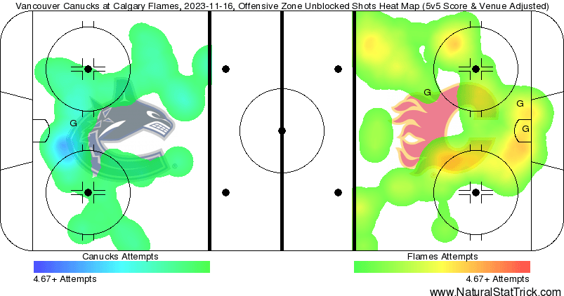 In The Crease – It’s nice to have a bit of a night off even though you played, isn’t it? The Canucks were able to test Markstrom a few times but as the game wore on and the gas tank for them was on empty it got easier for Markstrom. 1.26 expected goals against with just 1 getting behind him (5v5 SVA). After stealing one for the team against Montreal the team gave him a win on Thursday. That’s got to feel great when the team plays for you like that.